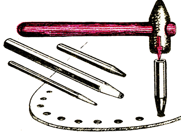 Для пробивания соединительных от разного размера в толстой коже пробойник. Впрочем, это вещь в нашем обиходе очень редкая. Придется обойтись самодельным набором стальных трубочек разных диаметров с острозаточенными краями. Ими пробивают в коже одинаковые отверстия с ровными краями. Они нужны не только для соединения деталей кожаной тесьмой, но и для декоративных отделок. Подробно об этих приемах немного позже.